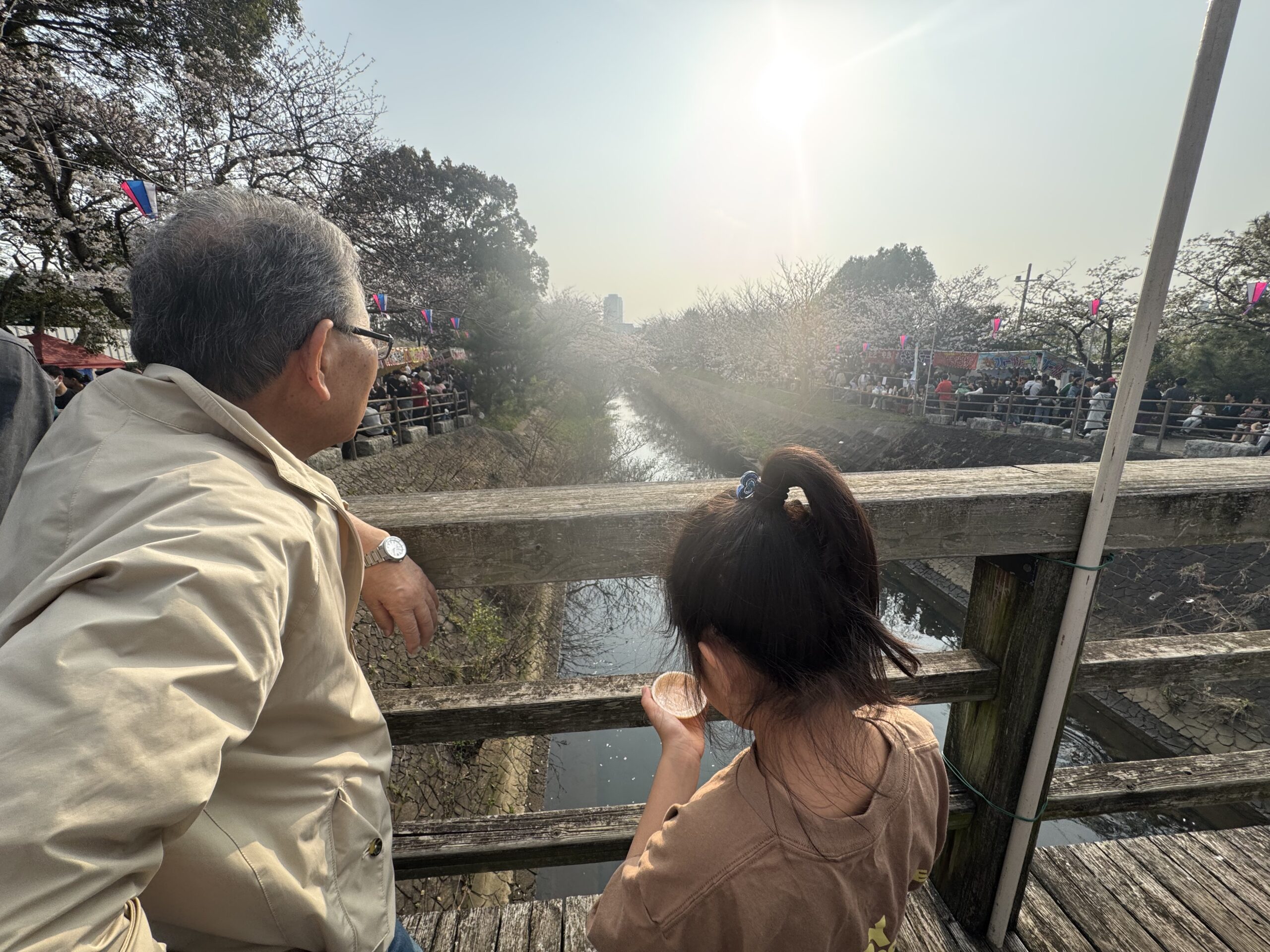 今日も花見。父も一緒に海老川沿いへ。