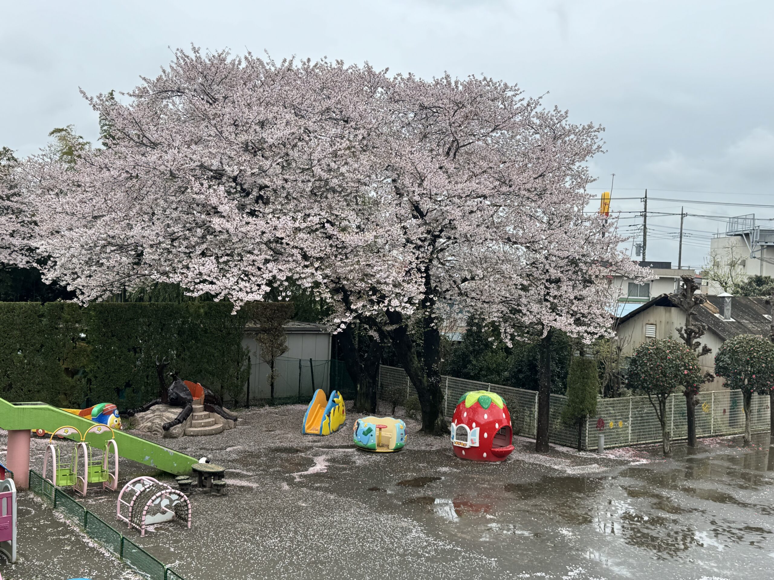 園庭の桜が満開。雨と風で落ちた花びらで地面も満開。