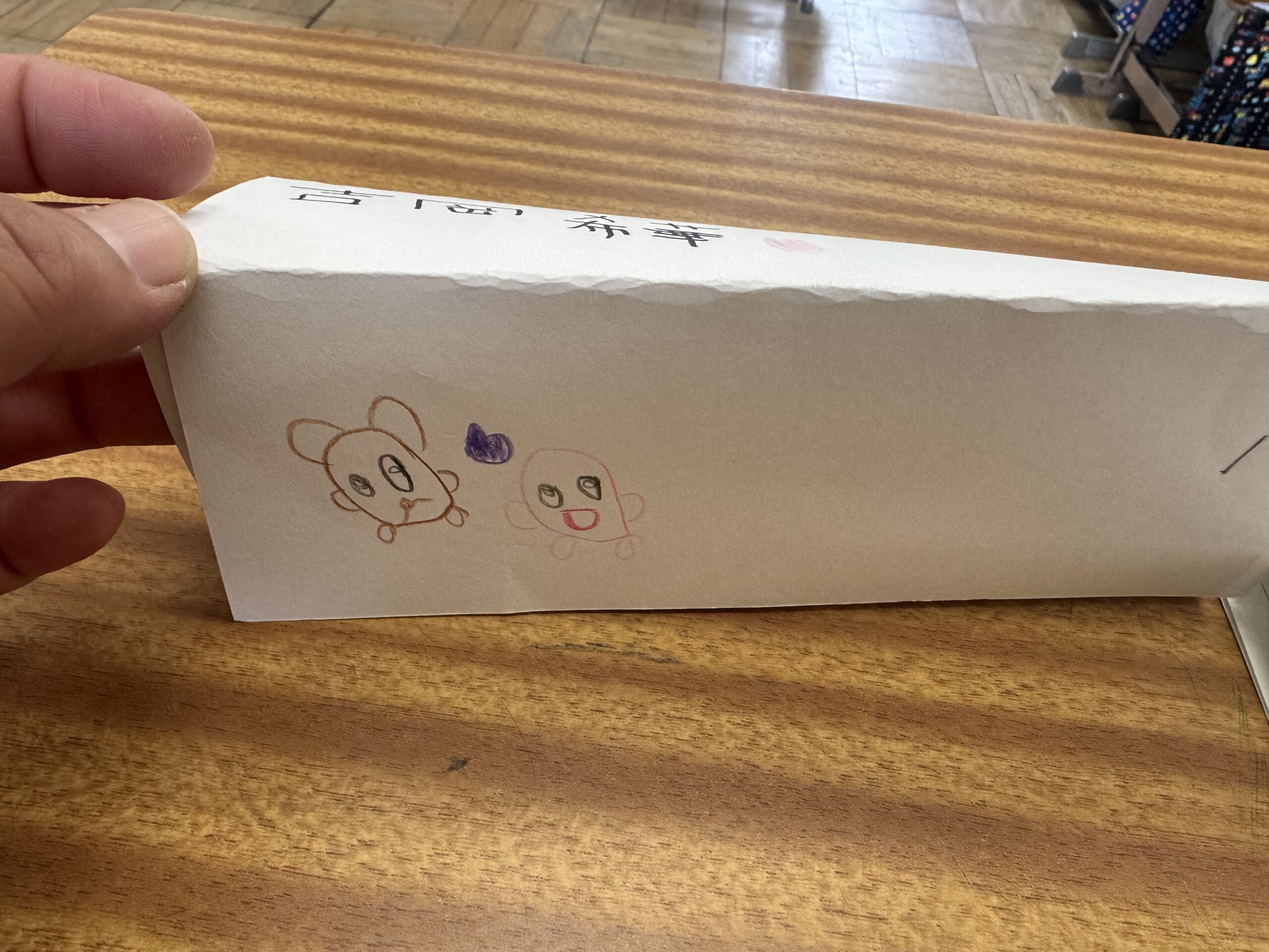 保護者は自分の子供の席に座るのだが、長女のクラスは目印に紙を三角に折ったやつを作ってくれていて、長女が下に絵を描いたから見てねと言われていた。