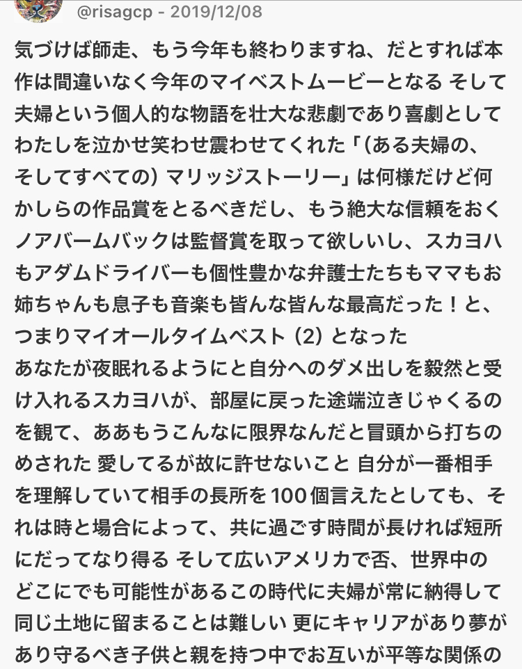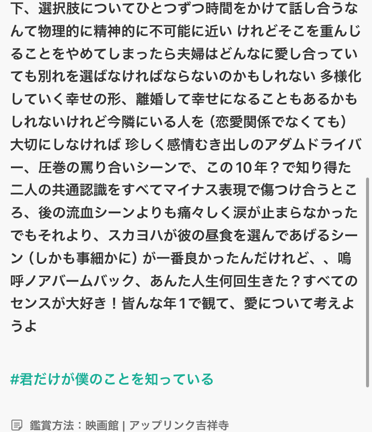 わたしの当時の感想を貼り付けておくので、もし観たことある人がいたら感想教えてください。笑 でも今観たらまた違う感想かもなあと思ったり。ちなみに11月末上映予定の『佐藤さんと佐藤さん』filmarksで“日本版マリッジ・ストーリー”という声があったので気になっている。