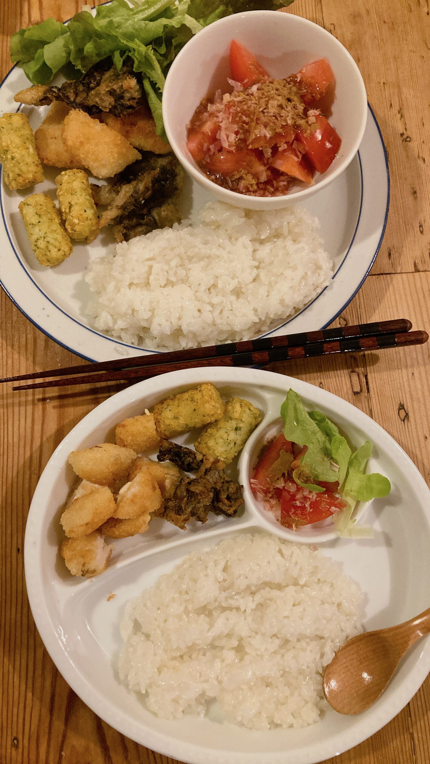 お迎え後、子どもはチョーご機嫌。わたしはまだお腹空いていないので夫と子どものご飯をつくる。つくるといっても生協のチーズささみフライに舞茸とポテトも揚げただけ。子どもは変わらず「一緒!」がうれしいから夫もワンプレート。何から何まで一緒なのが可愛くて写真とってみた。それにしてもよくたべる。3人一緒がいいけど、母は食べると眠くなるからひとり先に食べた方がコンディションがよいのだよ。みんなおつかれさま。