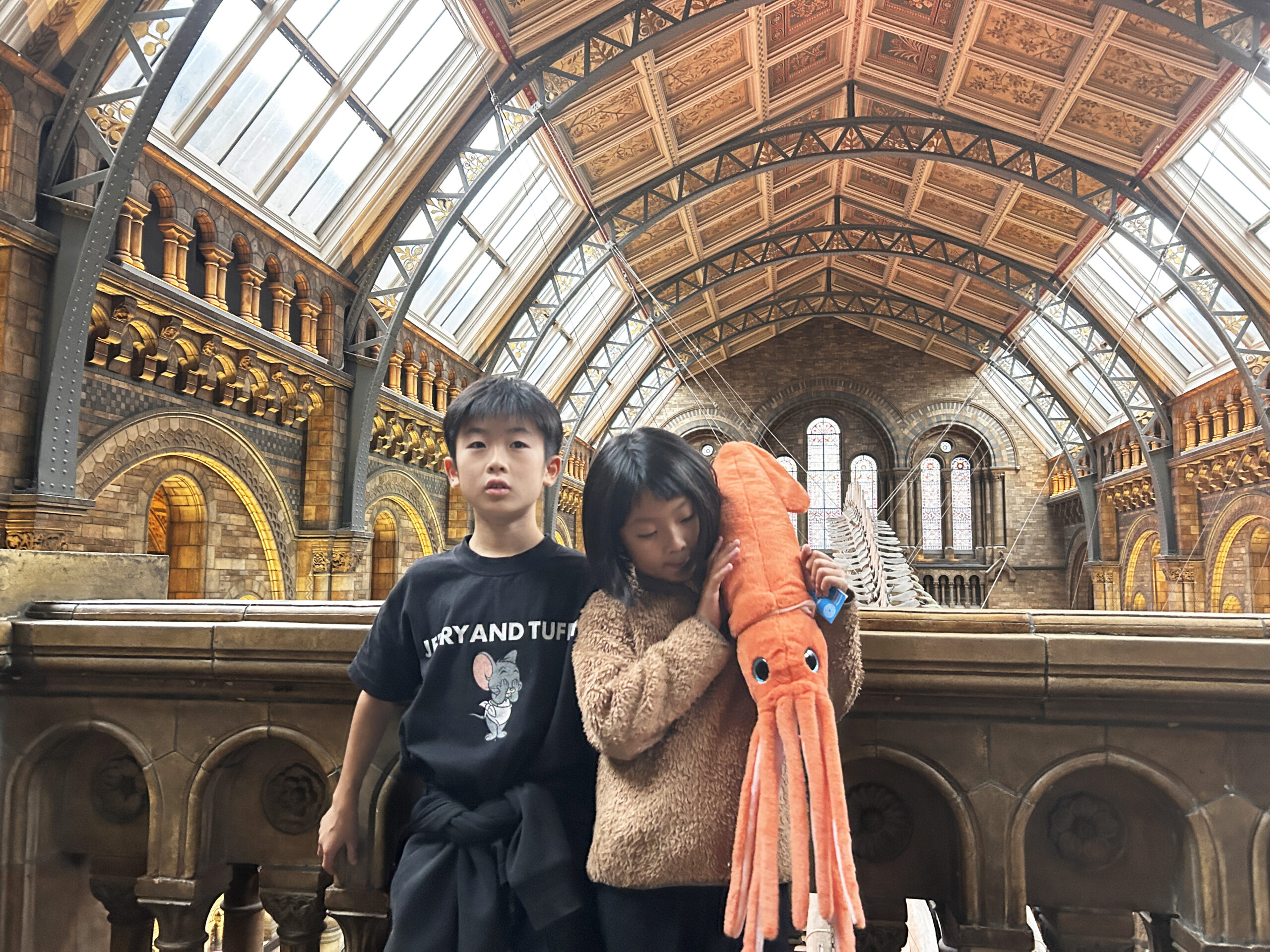 電車はいや!何にも乗りたくない!というムスメのリクエストのあった本日、エアビーから歩いて自然史博物館へ。昨日の大英博物館より好き。子どもはこちらですね。(イカ30£を買いました)