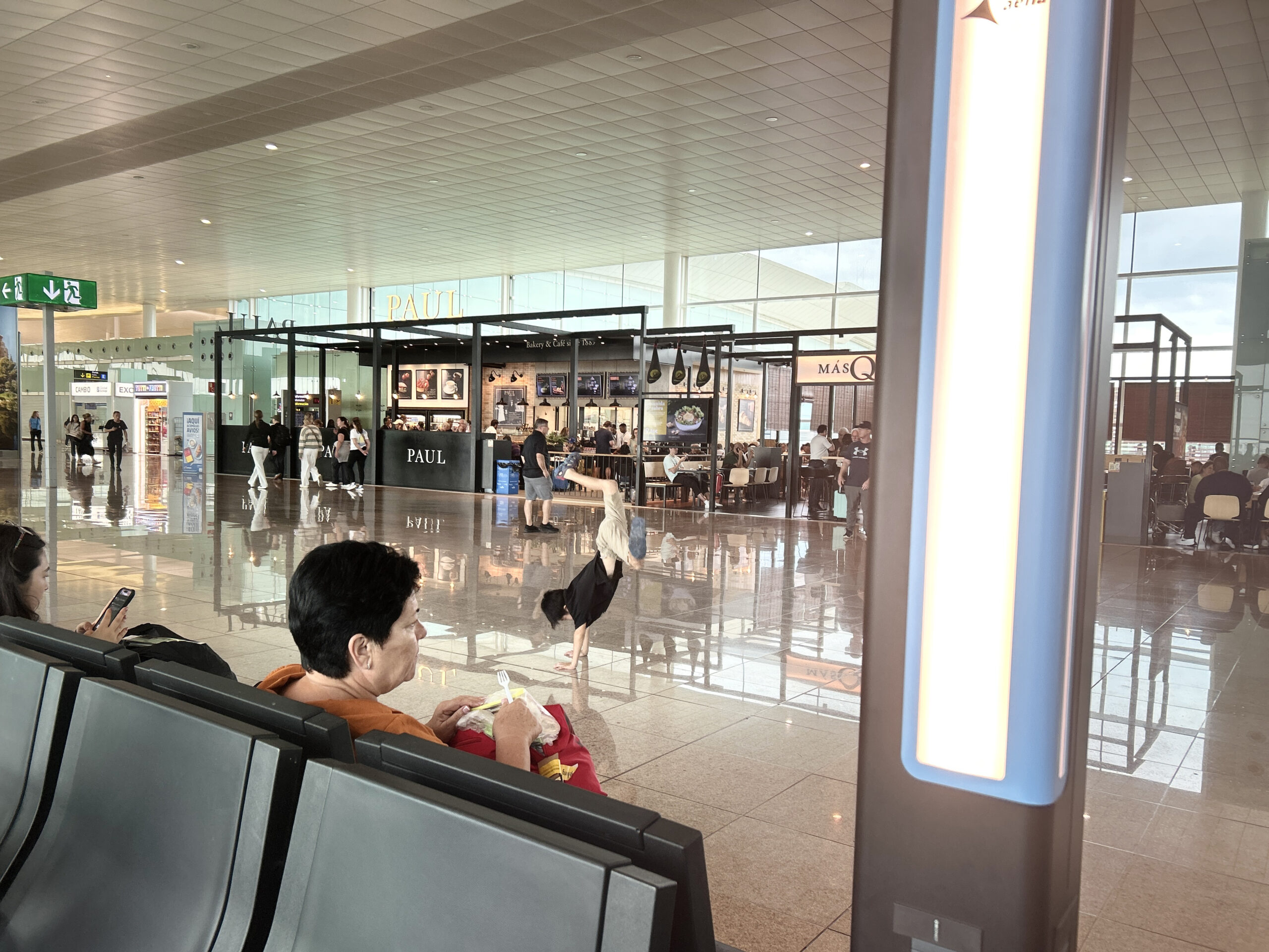 昨夜、日本へもどりました。写真は搭乗前のムスコ。手前のおばちゃんが目立ちますが、中央に見えますのが、側転をくりかえすムスコ。海外へいくと、なにか開放されるものがるのだろうか。旅行中、広い場所に出ると「ここはできそうだ」と側転していた。