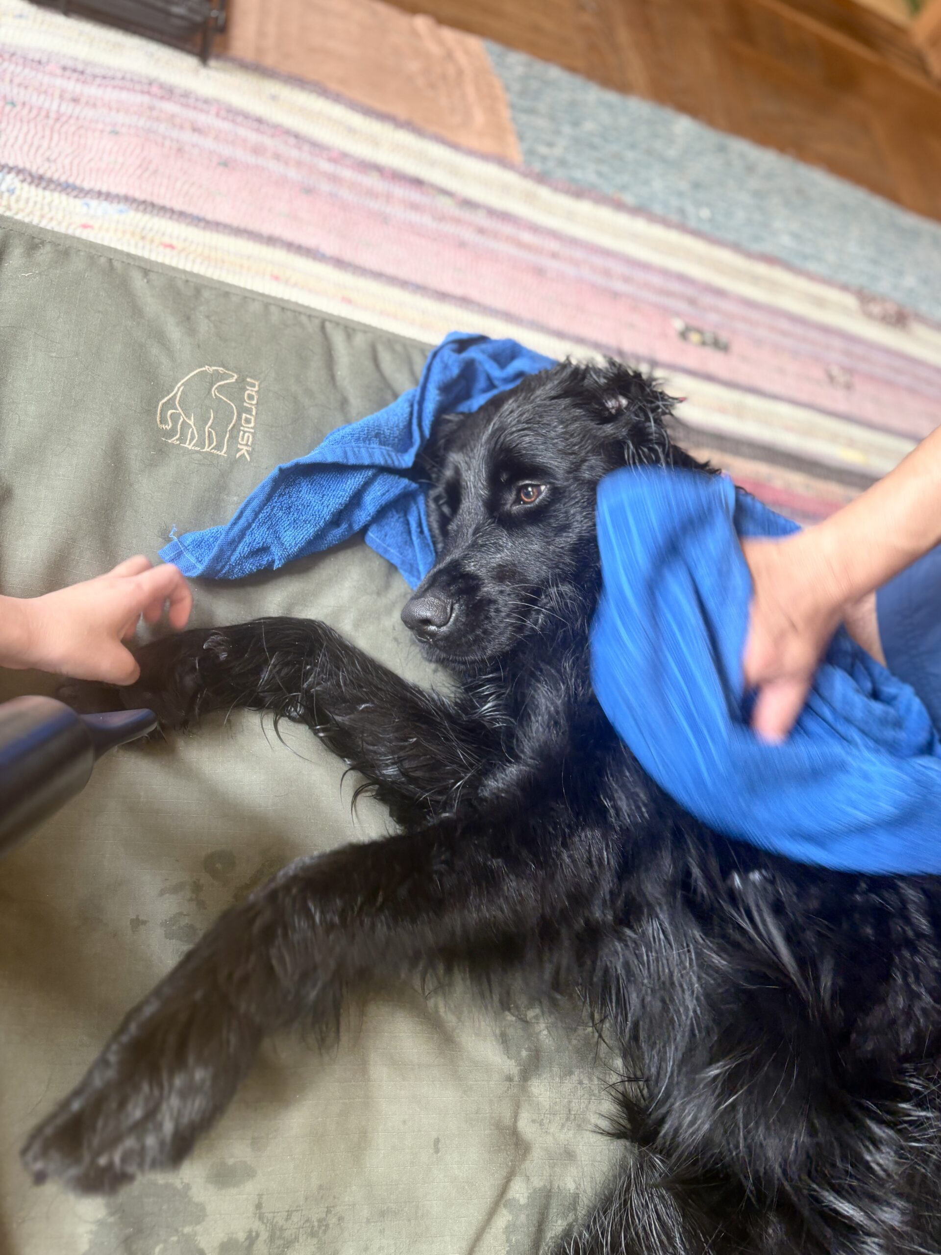 昼間は、久々にソラのシャンプーをオットとムスメが二人がかりで。この間、IKEAでソラ用に買った、IKEAカラーのバスタオルでふきあげ。