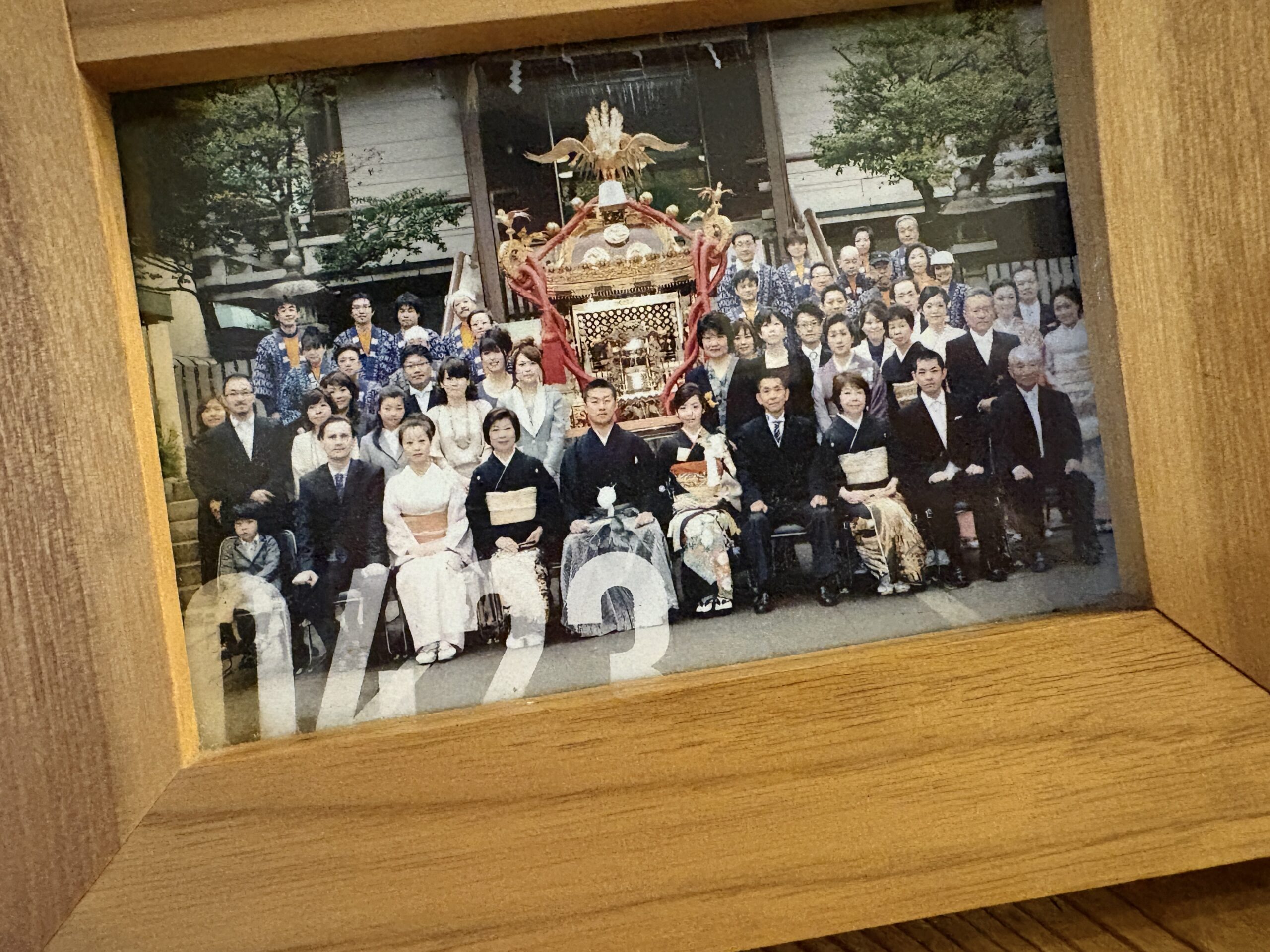 15年前の4月23日に結婚式をしました。写真の場所は、当時、私たちが住んでいた場所のそばの神社です。町内会の人たちが、私たちのためにお神輿をだしてくれました。写真の後列、お揃いの半纏を着ている人たちが町内会の人たちです。神社で結婚式を挙げる人はいますが、お神輿があるのは、少しスペシャルなことだと思います。この日は朝から雨が降っていたけど、私が集合写真を撮りたいと思っていたタイミングに晴れました。大好きな人がたくさん写っている大好きな写真です。
